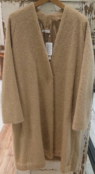 シルエットは厚手のニットも着やすいラグランスリーブで羽織りやすく、首は襟なしV字のため女性らしいすっきりとした印象でした。インナーがちらっと見えるのも可愛いです。