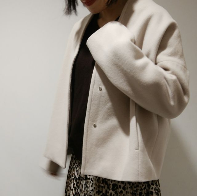 首に沿う様なネックラインで、中に着たニットが見えにくくなっています。