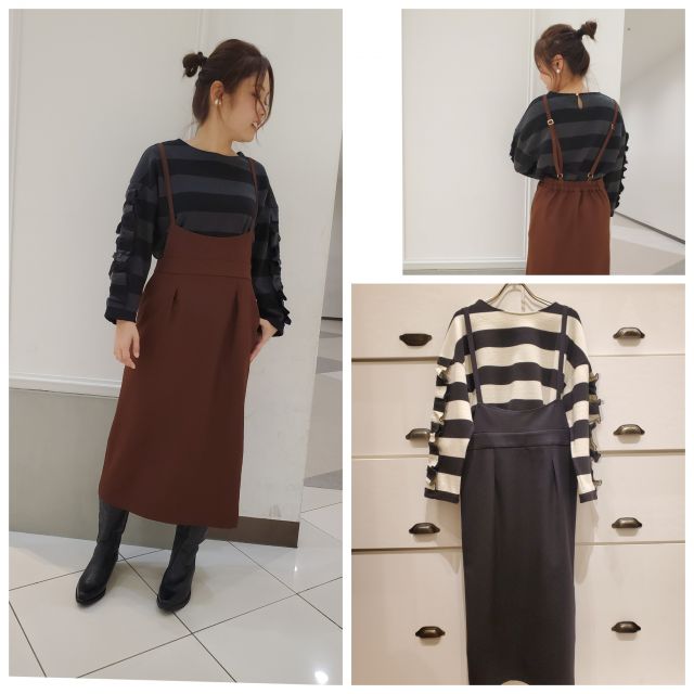 季節の変わり目、インナーを調節できるジャンバースカートです。
