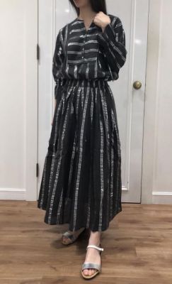 落ち着いたらブラック×ホワイトの柄モチーフが可愛くなりがちな花柄をオシャレに、そして、斜め前に入ったスリットが足さばきもよく軽やかな印象です。